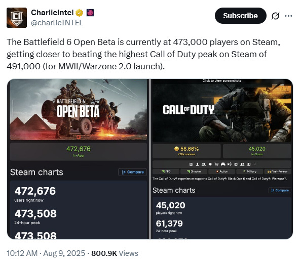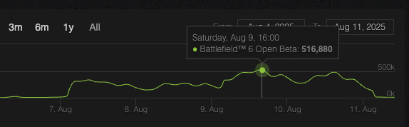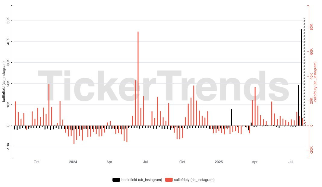 The open beta for Battlefield 6 set new industry records by topping 516,000 concurrent players on Steam, overtaking Call of Duty’s previous record.Battlefield 6 is currently nearing Call Of Duty Black Ops 6 launch in Instagram follower growth. For context, Black Ops 6 was the largest Call Of Duty launch of all time. We saw the “@battlefield” Instagram jump ~120k followers in the last three weeks compared to ~70k followers for “@callofduty” in the Call of Duty 6 launch three week period.