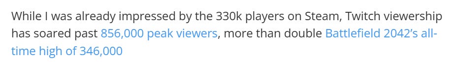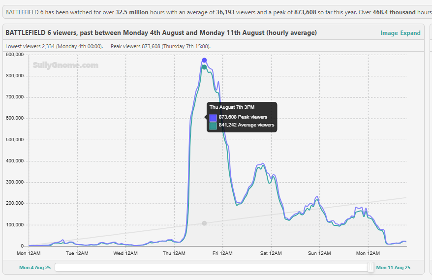 Twitch viewership also exploded, hitting ~873,000 or double the peak 346,000 seen during Battlefield 2042.