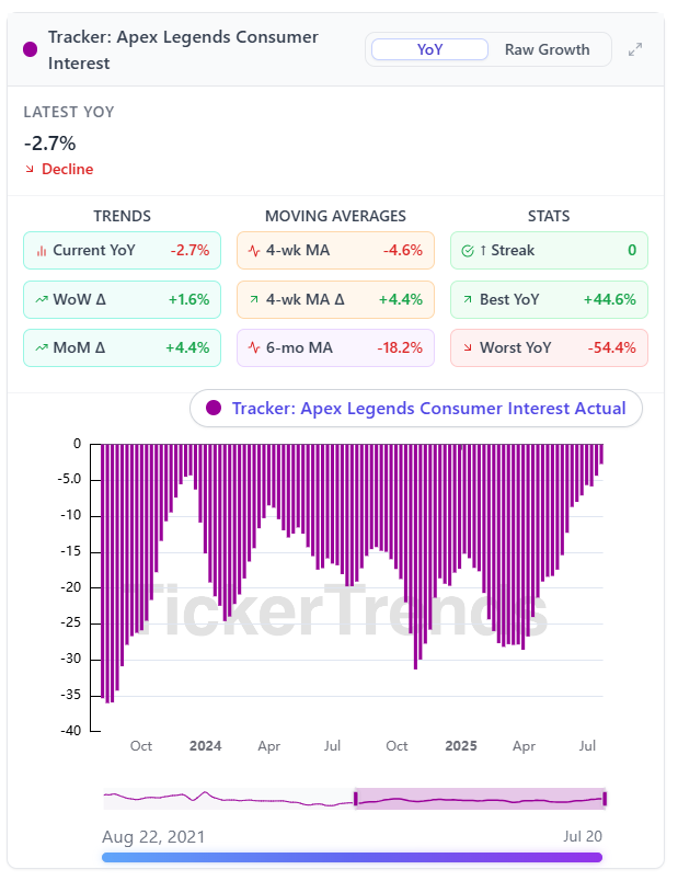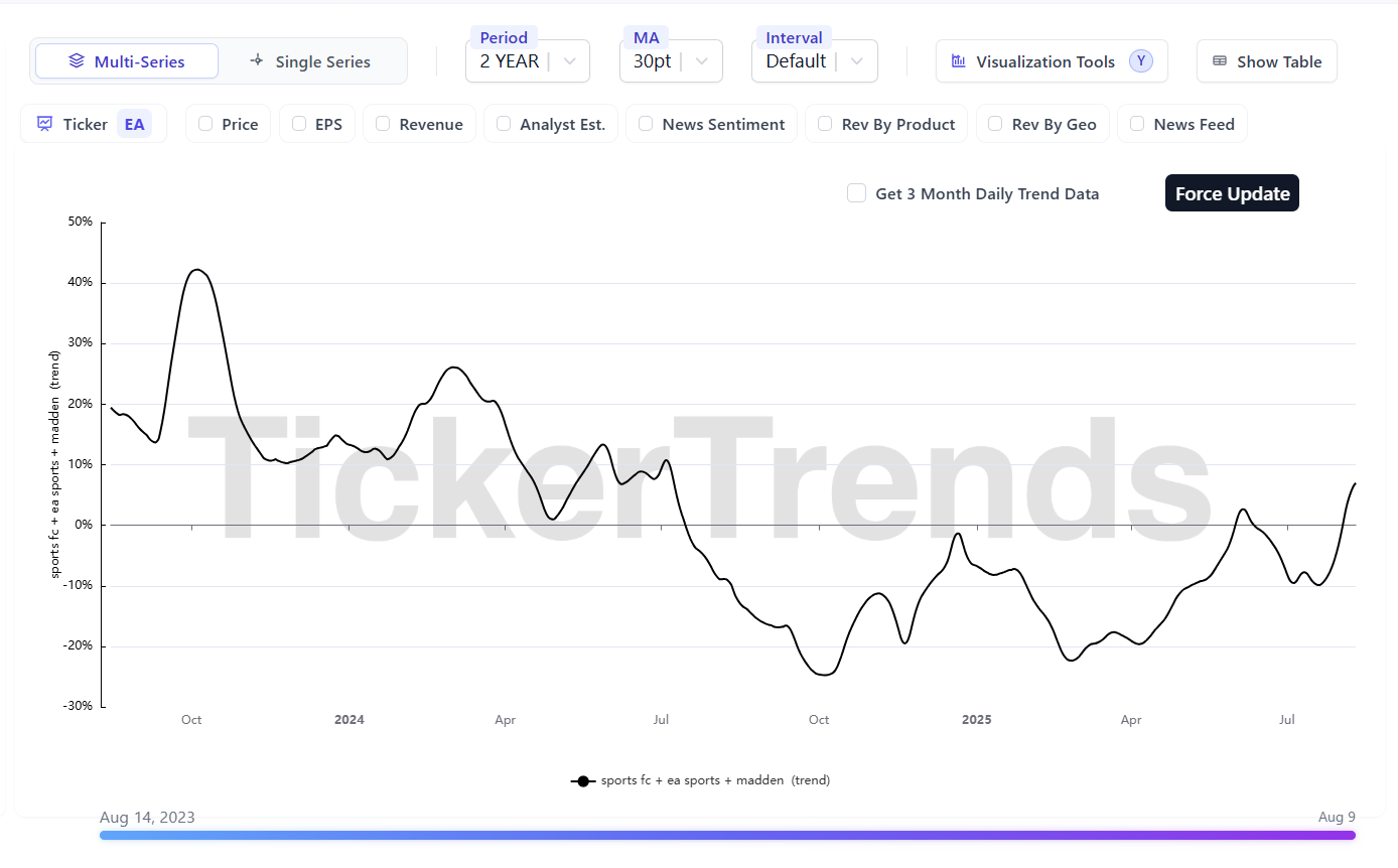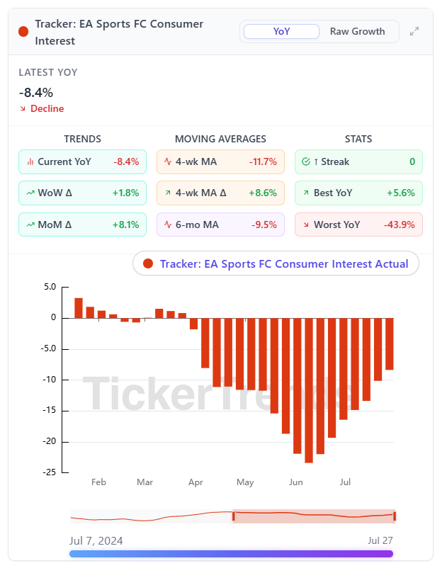 Tracking shows slightly weaker consumer interest compared to last summer, with YoY and moving average trends pointing to a mild decline. This suggests bookings from EA Sports FC could underperform versus last year’s launch cycle.
