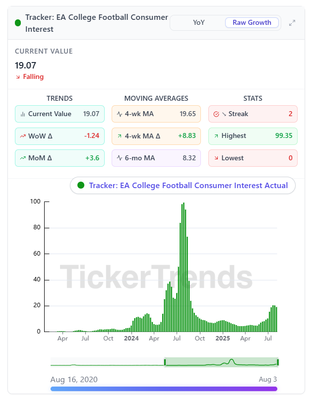 In FY2025, EA College Football significantly aided the company’s number to the tune of roughly ~400M-450M according to an analyst at Baird. We see a strong decline this year in our tracker compared to the hype last year.
