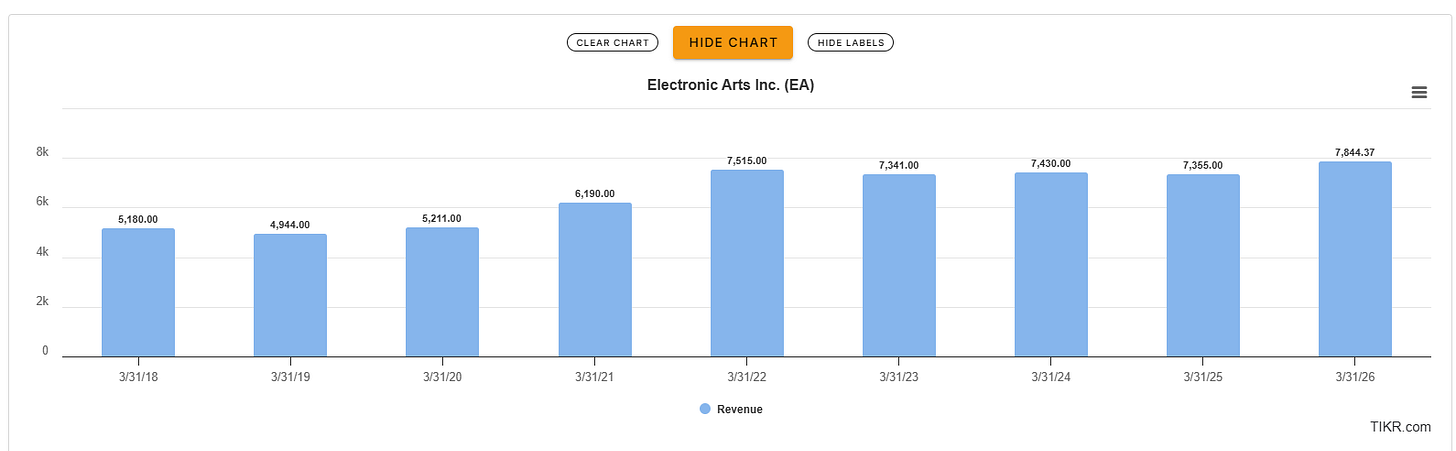 EA 0.00%↑’s FY2025 Net Bookings were $7.355 billion and the company is guiding to $7.6 billion to $8.0 billion.