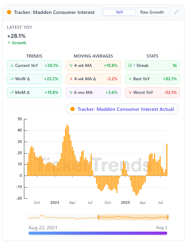 Tracking indicates flat to positive consumer interest compared to last year, with YoY growth of +28.1%. Madden remains a stable and dependable bookings contributor with consistent annual release momentum.