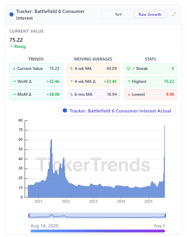 Battlefield 6 is generating a level of attention that rivals industry leader Call of Duty. Our real-time trackers show Battlefield-related search interest is hitting new highs, well above previous franchise peaks.