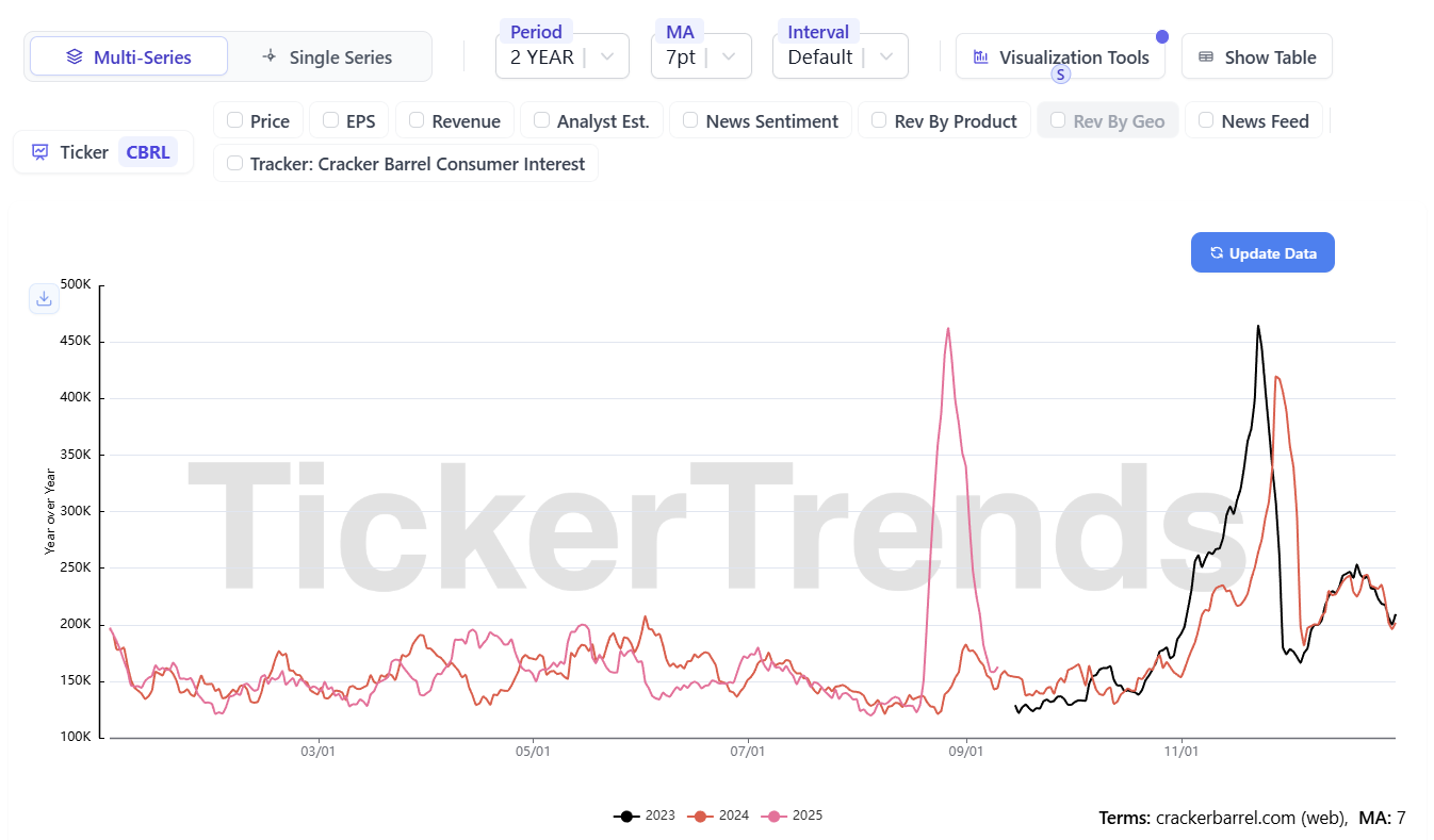 With social and web interest failing to hold at elevated levels, we do not see evidence that recent consumer buzz will translate into meaningful or lasting revenue gains. For now, Cracker Barrel remains a name to avoid before their earnings report.