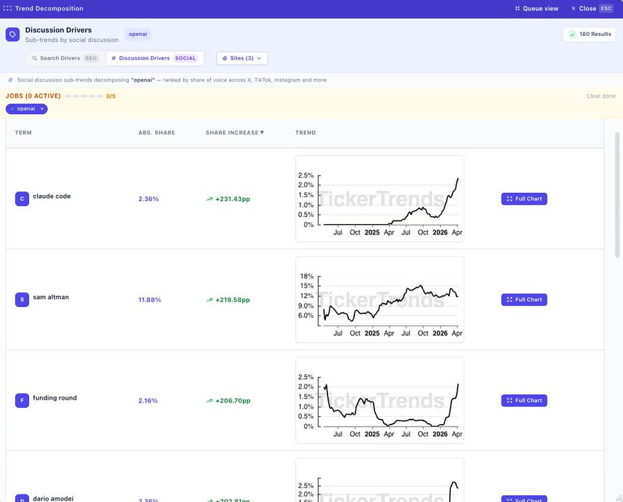 This feature breaks down shifts in discussion share into their underlying components, helping users understand the source of momentum, not just the outcome.