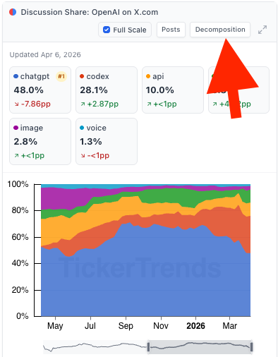 TickerTrends is introducing Discussion Share Decomposition, a new feature designed to go one layer deeper than traditional discussion share analysis.