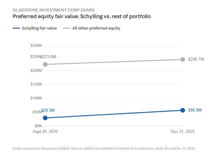 In fiscal Q3 2025 alone, Schylling’s valuation increase generated ~$27.7M in unrealized gains for GAIN, exceeding the contribution from the rest of its preferred equity portfolio and representing a meaningful per-share impact.
