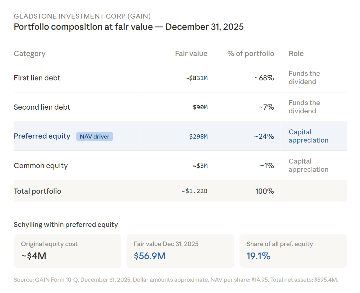 GAIN’s total net assets as of December 31, 2025 were roughly $591 million (NAV of $14.95 × approximately 39.5 million shares). The Schylling preferred stake alone, at $56.9 million fair value, represents roughly 9.6% of total NAV.