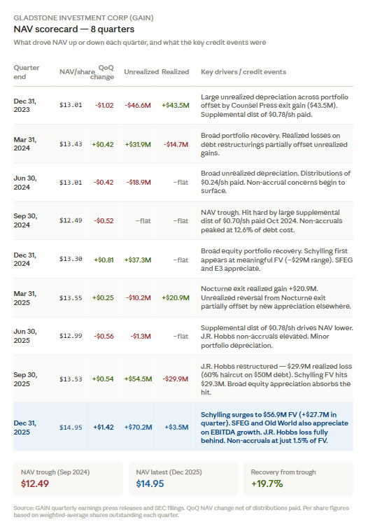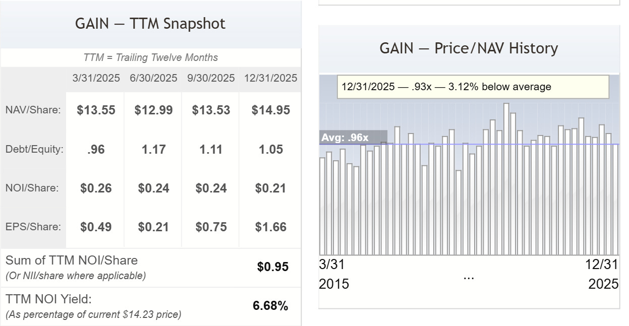 GAIN’s debt portfolio (~75% of assets) continues to generate stable monthly income, supporting its $0.08/share dividend. The key change is in the equity book: Schylling alone added ~$0.70/share to NAV in a single quarter (+$27.7M on 39.8M shares). Shares currently trade at a ~7% discount to the $14.95 NAV, in line with historical ranges (~±10%).