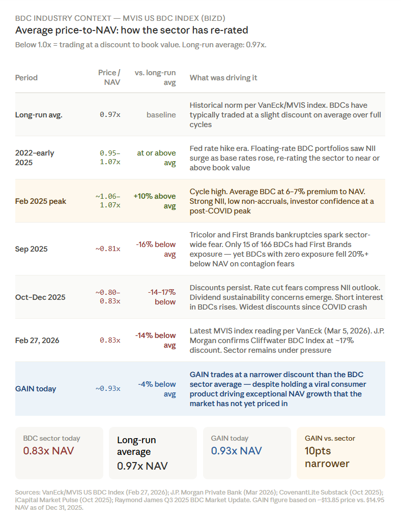 GAIN currently trades at ~7% below NAV, consistent with historical ranges. The setup offers a combination of stable yield and upside from embedded equity revaluation. Risk/reward appears favorable, though positioning requires close monitoring of underlying demand and KPI trends.