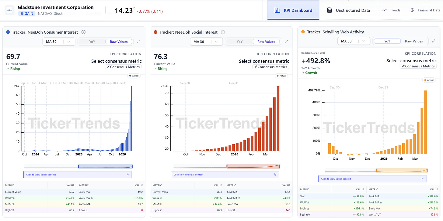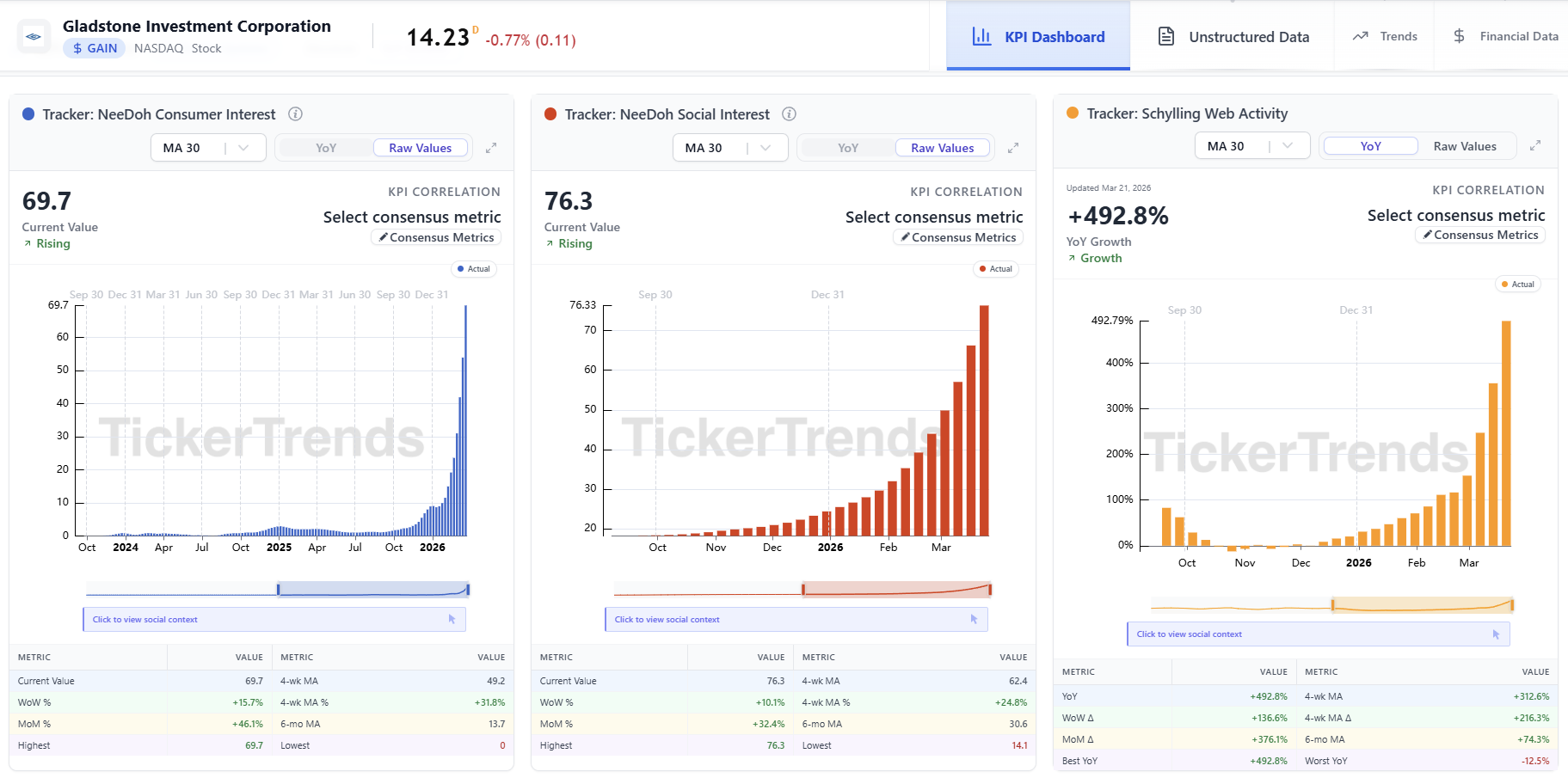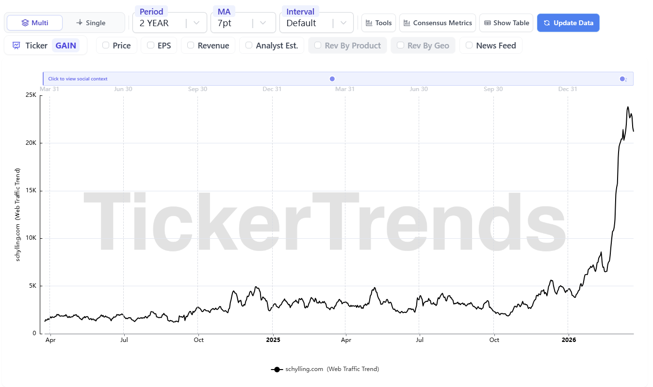 Since December 31, 2025, the last quarter-end date reflected in GAIN’s filings, our consumer interest tracker has risen an additional 8x, now registering 69.7. The next quarterly mark will be the first opportunity for the market to see whether the EBITDA trajectory has continued to follow the consumer data higher.