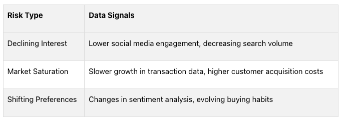 Consumer data can act as an early warning system for potential investment risks. By tracking real-time behavior, you can identify red flags before they affect market performance. Here are some examples: