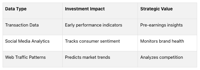 Why It Matters: Real-time data like transaction trends and social media activity helps investors predict market shifts faster than traditional methods.