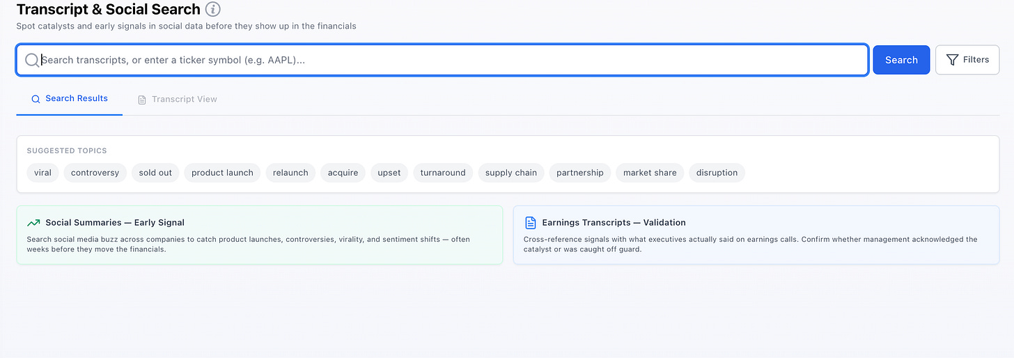 Social Search is a feature within the TickerTrends platform that allows users to search across social data and company transcripts for specific keywords, events, or catalysts.