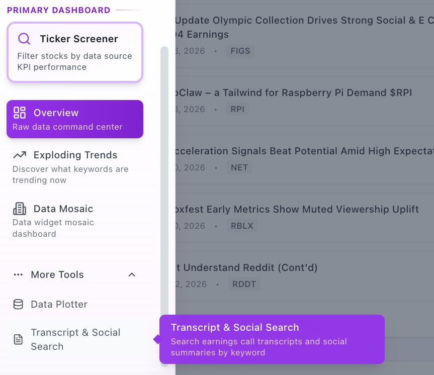 TickerTrends’ Social Search tool helps investors surface these signals by scanning millions of social posts and corporate transcripts to identify key developments around companies, products, and trends in real time.