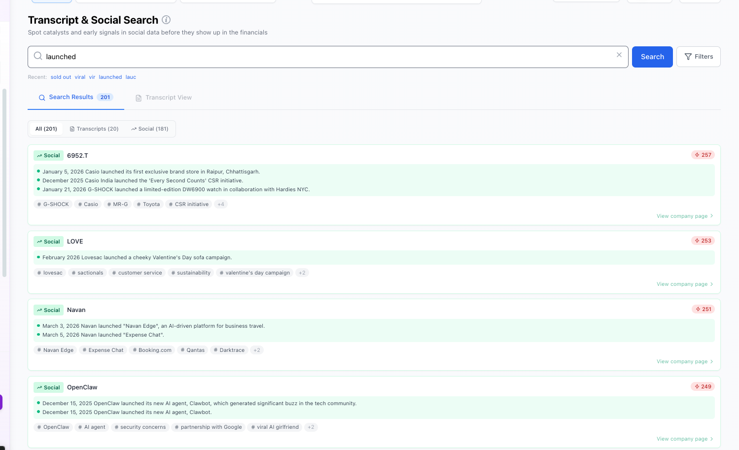 Surface product launches, partnerships, and emerging narratives across social platforms and corporate transcripts before they impact financial results