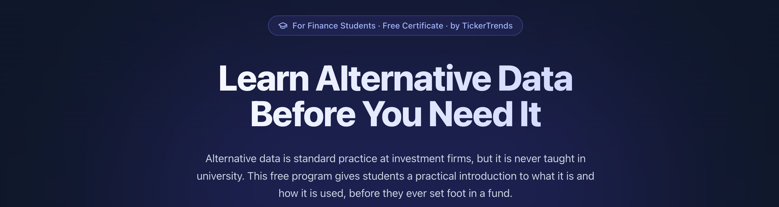 That’s why TickerTrends has launched a free Education Program and Alternative Data Certificate, designed specifically for students and aspiring analysts who want hands-on experience before entering the workforce.