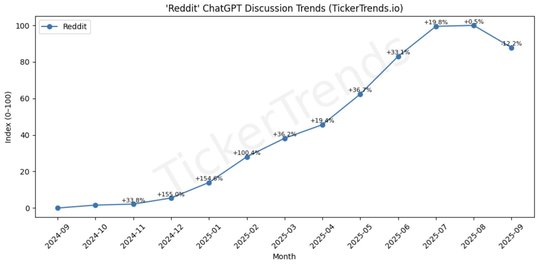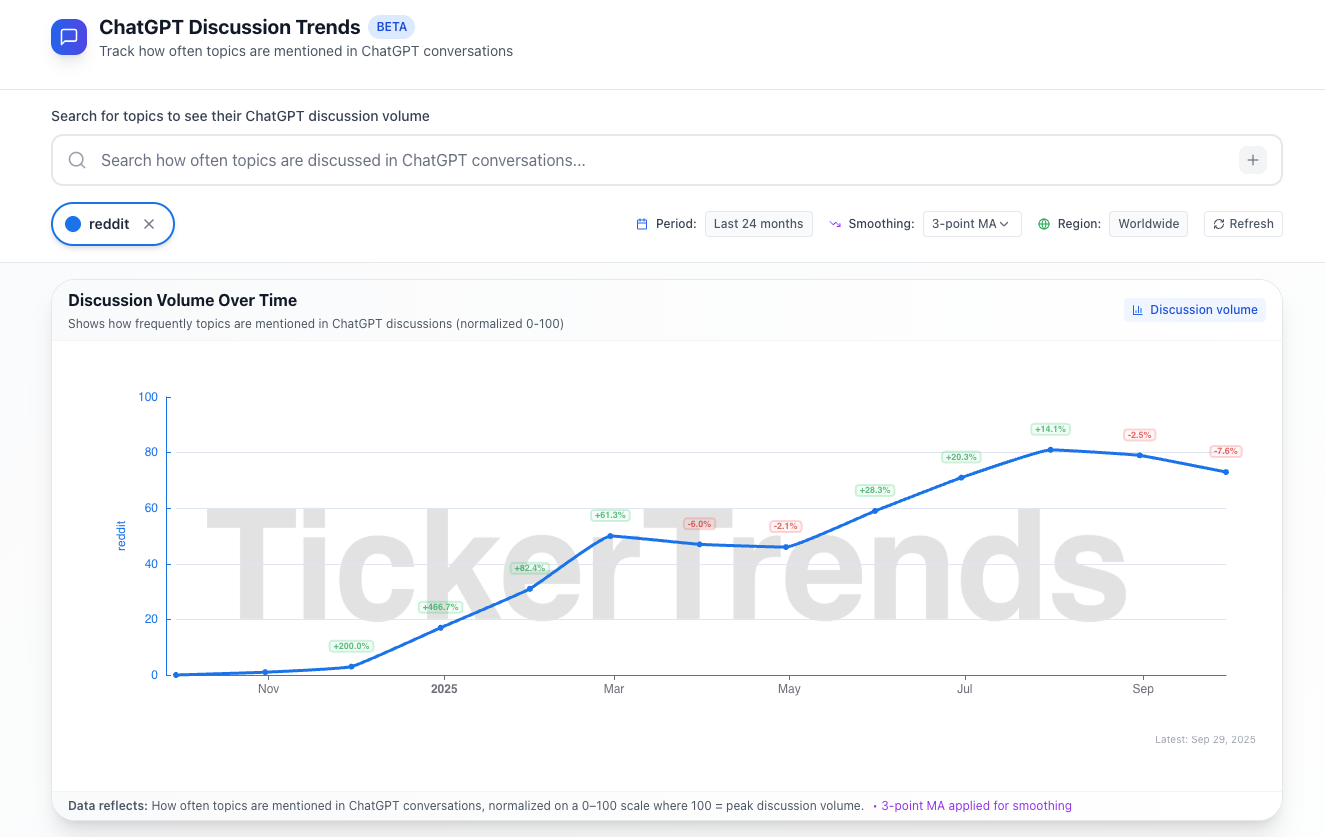 The chart below shows the relevancy of Reddit on ChatGPT have grown steadily since late 2024. Using TickerTrends’ proprietary monthly index, the data captures how often Reddit conversations and outbound links referencing Reddit appear within ChatGPT interactions.