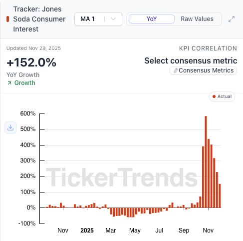 Explosive Brand Heat: Consumer interest in the Jones Soda brand has hit a peak of nearly 600% YoY growth.