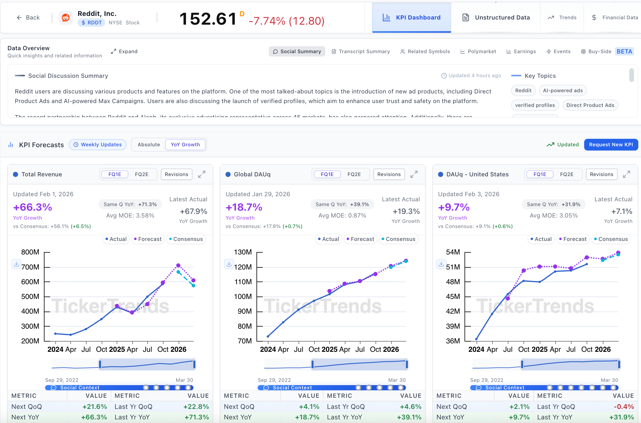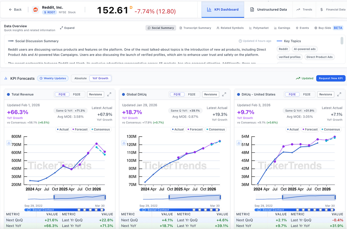 Media and internet platforms are driven by attention, engagement, and activity that changes in real time. User growth, content consumption, transaction frequency, and advertiser demand often shift long before revenue is reported. That is why TickerTrends provides real-time KPI coverage across Media, Internet, Platforms, and Social, helping investors track how users and advertisers are actually behaving day to day.