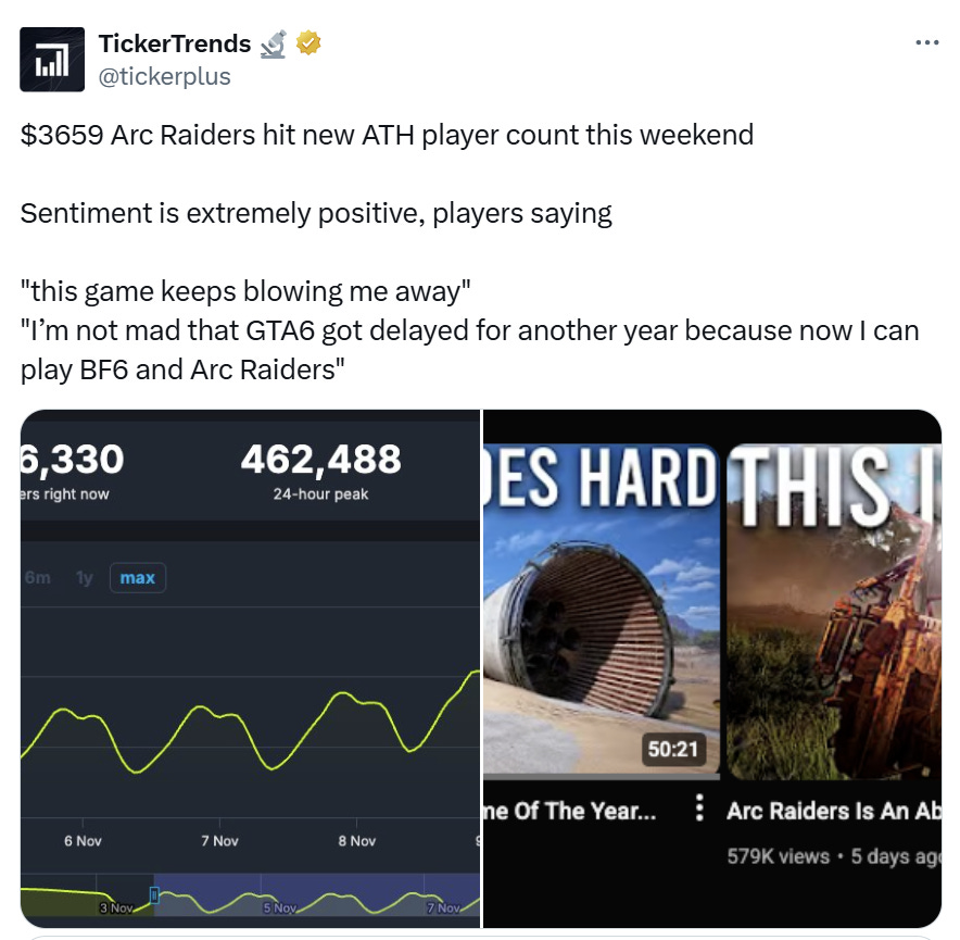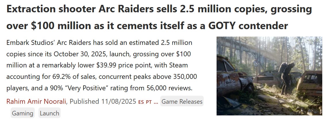 Arc Raiders week-one sales about 2.5 million units at 40 dollars. Strong signal for Q4 guide. Momentum has continued into the current week (Nov 10).
