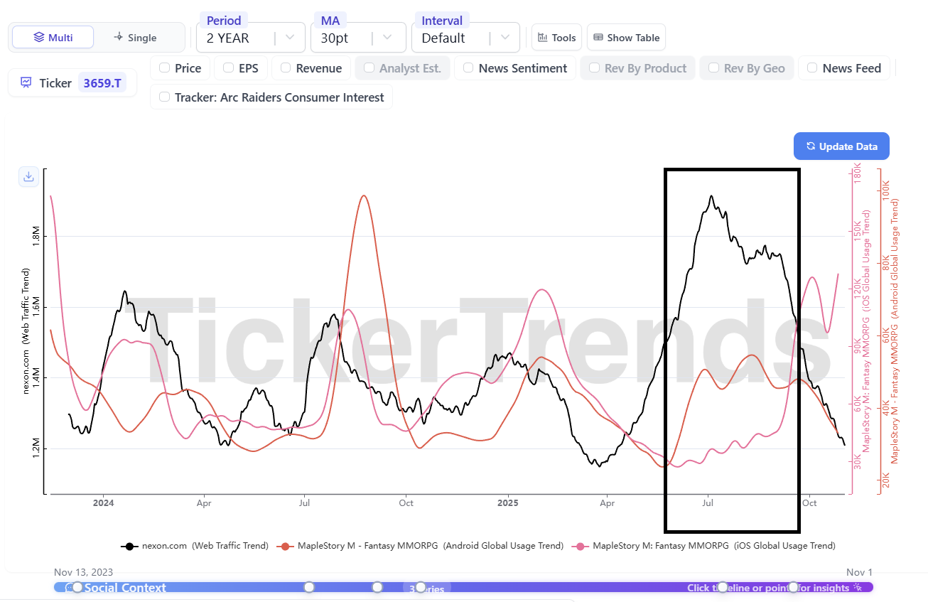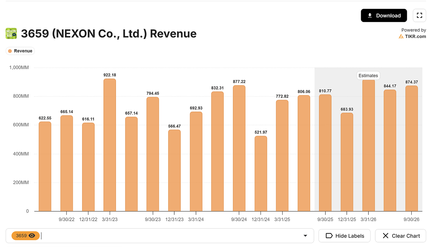 These legacy titles remain Nexon’s profit engines. MapleStory had strong summer updates, and tracker data continues to show solid engagement although there was a recent slowdown. Dungeon & Fighter Online should remain steady, but the mobile version has faced more competition. Investors will want to hear if there’s any new content roadmap that can reaccelerate player activity in early 2026.