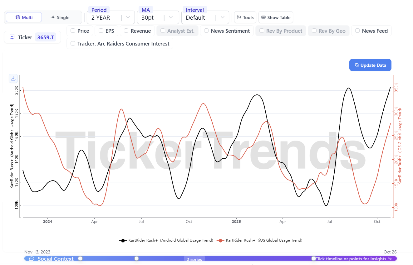 KartRider+ has seen stability. Mobile App data shows that global engagement has held relatively steady. Any update on performance in Western markets would be incremental good news.