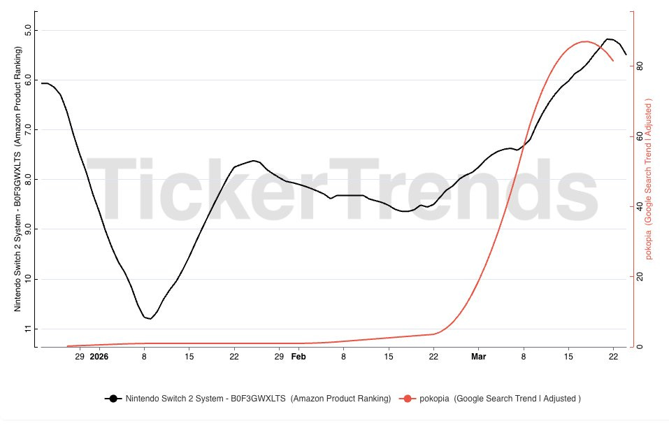 Following the launch of Pokémon Pokopia in early March, Amazon sales rank for the Nintendo Switch 2 improved from ~#8 to ~#5.5, indicating a meaningful acceleration in purchase velocity following the Pokopia release.