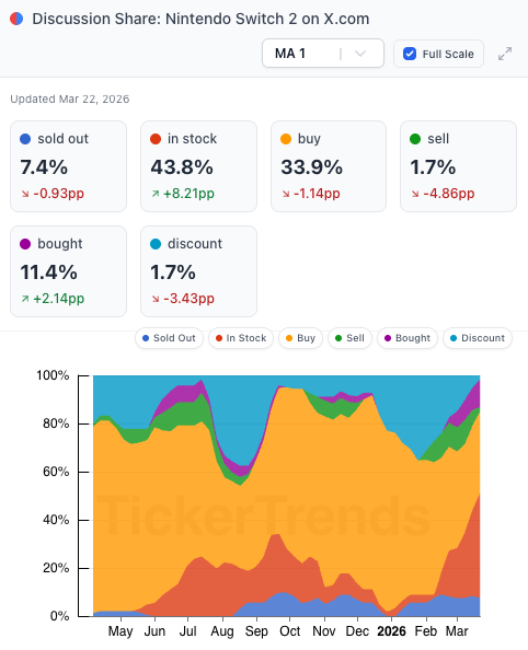 Discussion dynamics on X.com have shifted meaningfully, with mentions of “discounts” declining while “in stock” discussions rise. This shift suggests a transition from demand stimulation toward availability constraints, typically indicative of stronger underlying demand.