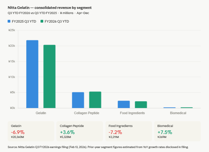 FY2026 guidance calls for 40,000M yen in revenue (+3.2% YoY) and 4,000M yen in operating income. Current North America demand trends in gelatin and collagen suggest upside to this outlook if conversion into volume materializes. Additional upside would require stabilization in Japan, which remains a drag.