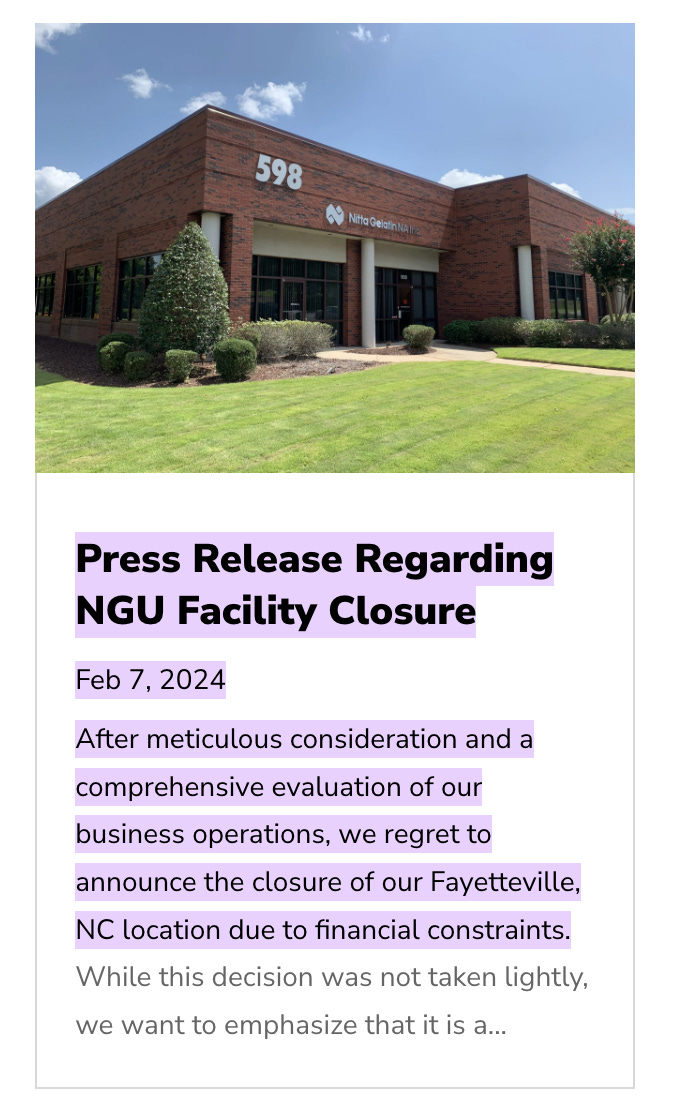 Management specifically called out North America demand in their latest earnings report with explicit mention of “demand for protein bars and similar applications”. The trend has significantly accelerated since that point. As top of funnel collagen demand rises, we think Nitta will continue to experience outperformance in this segment.
