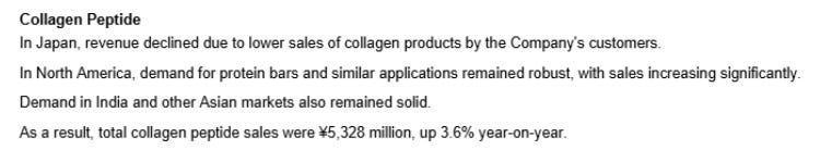 Collagen Peptide: 5,328M yen, up 3.6% YoY