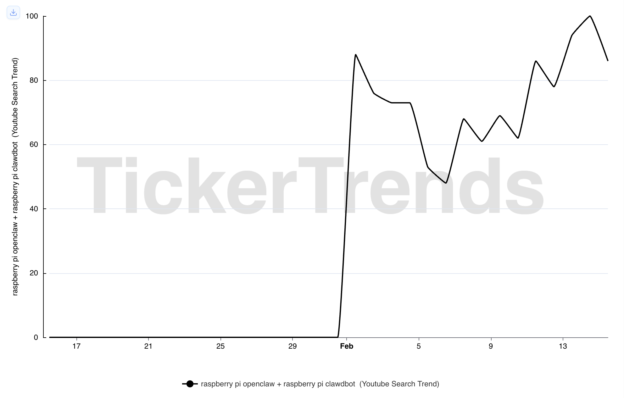 YouTube Search Spike (OpenClaw + Pi/Clawdbot terms): Explosive Feb 2026 jump (near-zero to ~80–100 index) from tutorials/guides, many Pi-focused.