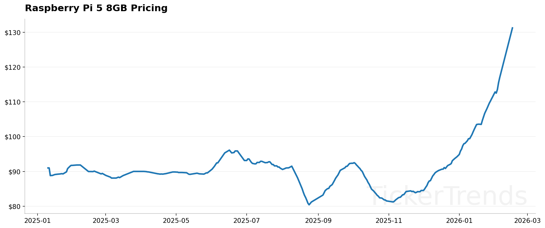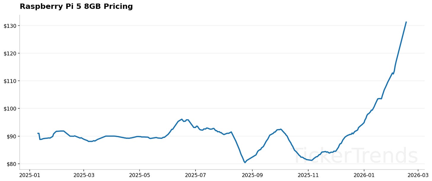 Pi 5 8GB Pricing Trend: Sharp rise from late 2025 (~$80-100) to ~$125-130+ in Feb 2026, reflecting memory hikes + incremental demand pressure.