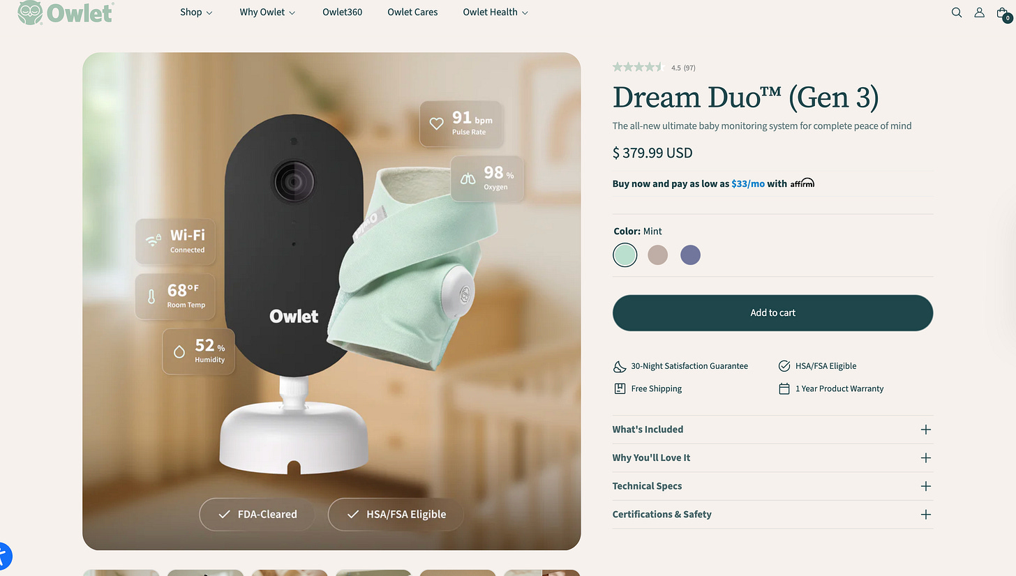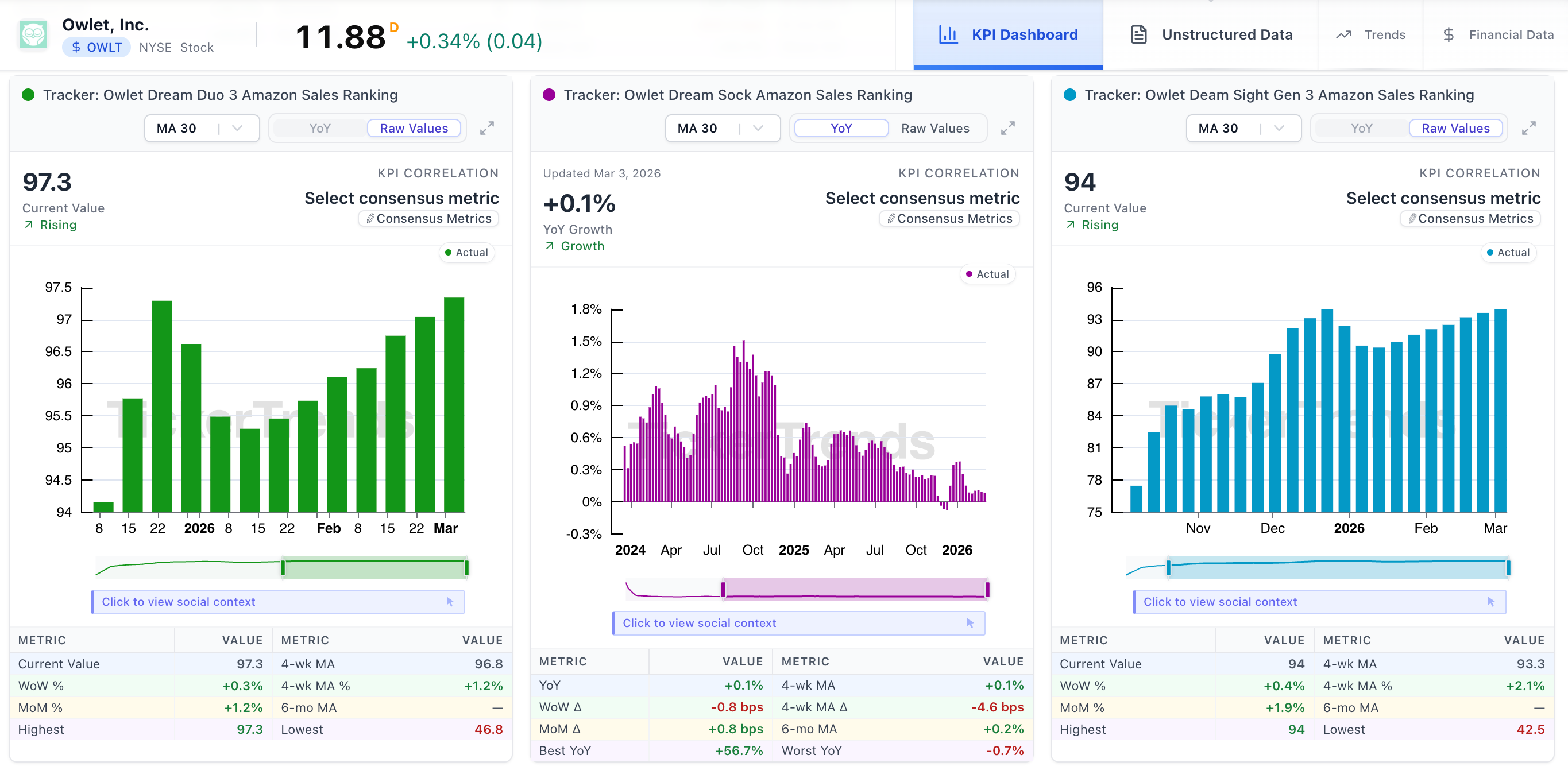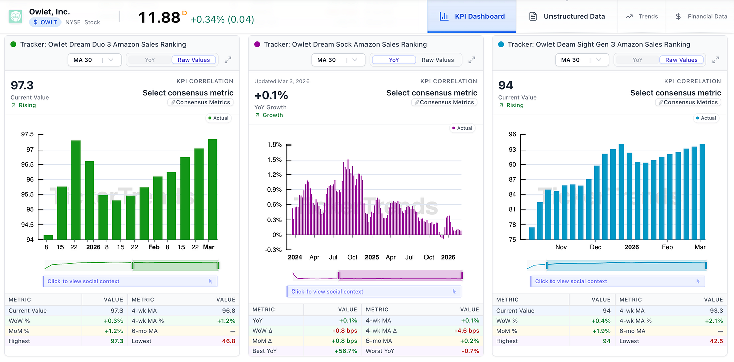 Amazon sales rankings for Owlet Duo Gen 3 and Owlet Sight Gen 3 have been trending higher, indicating improving hardware velocity. The Dream Sock ranking remains stable to modestly positive, suggesting steady demand rather than deterioration.