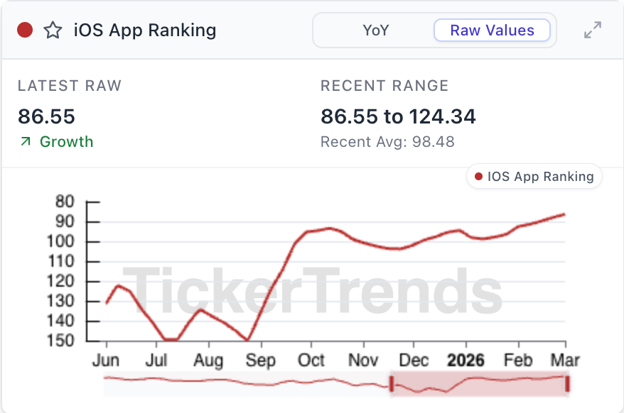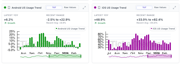 Mobile app usage trends broadly mirror the reported subscriber trajectory. iOS usage growth of +48.9% YoY reflects strong engagement expansion, while Android growth of +6.2% YoY indicates stable but slower platform contribution.