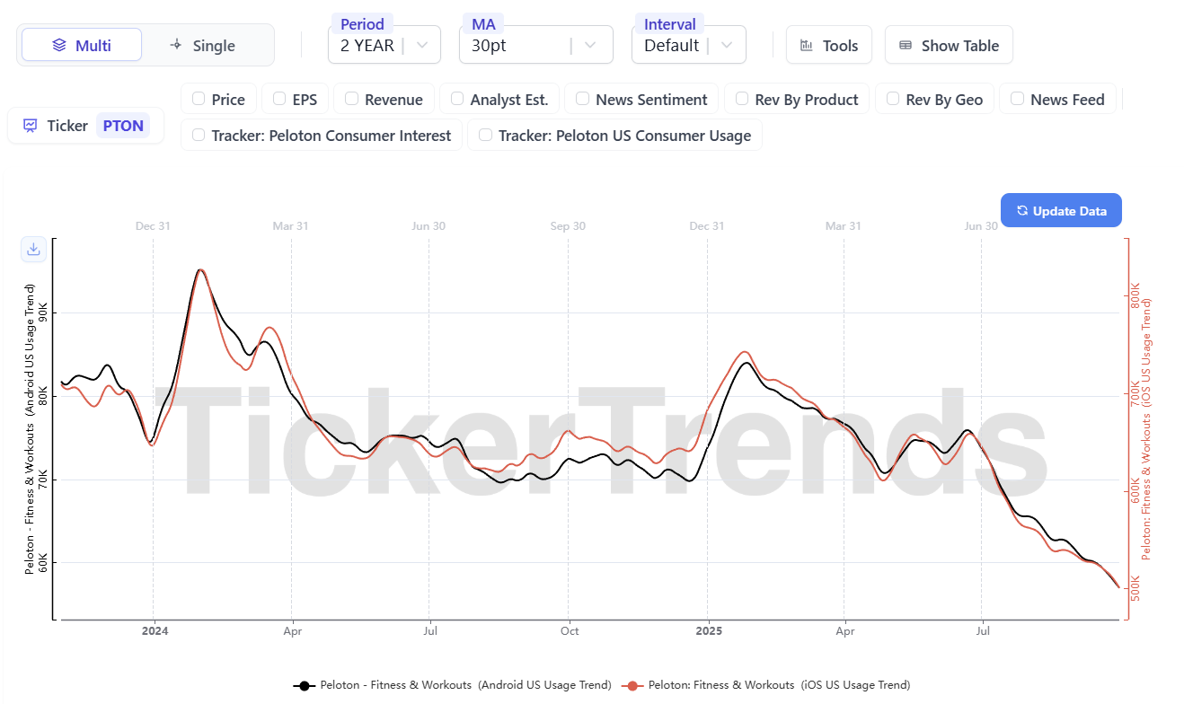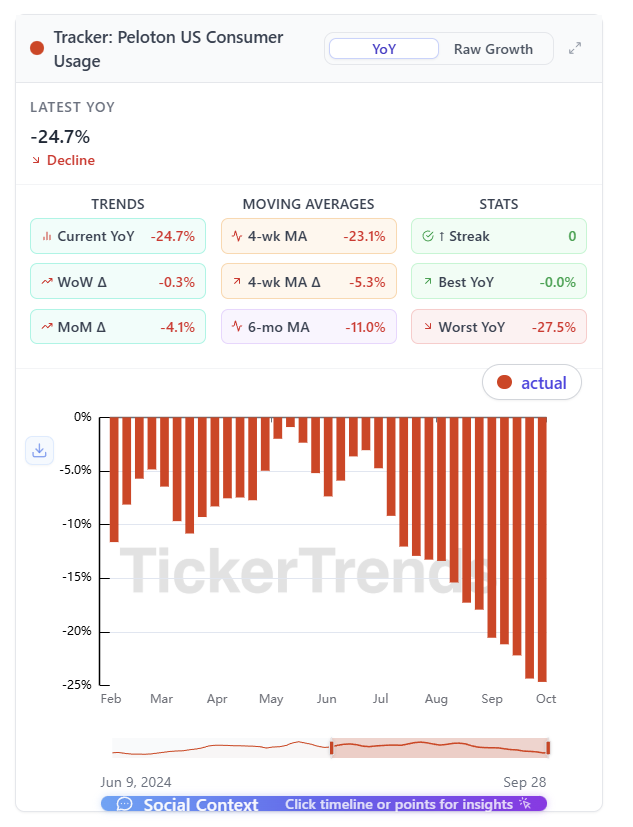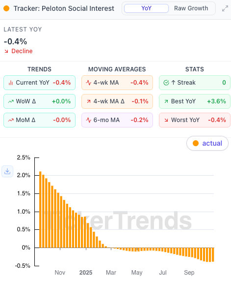 Brand strength may be fading. The drop in social metrics (Instagram followers turning flat or negative) supports the view that Peloton might be losing cultural momentum among consumers.