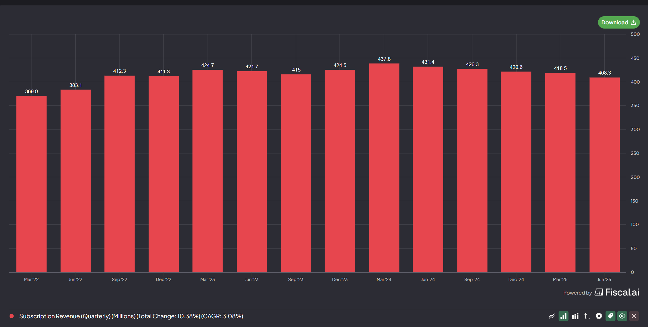 Last quarter saw a ~$10M drop to $408M. We see this trend accelerating to downside. We see a sub $400M Subscription Revenue coming along with continued weakness for future quarters, likely more than investors betting on a turnaround in the name expect.