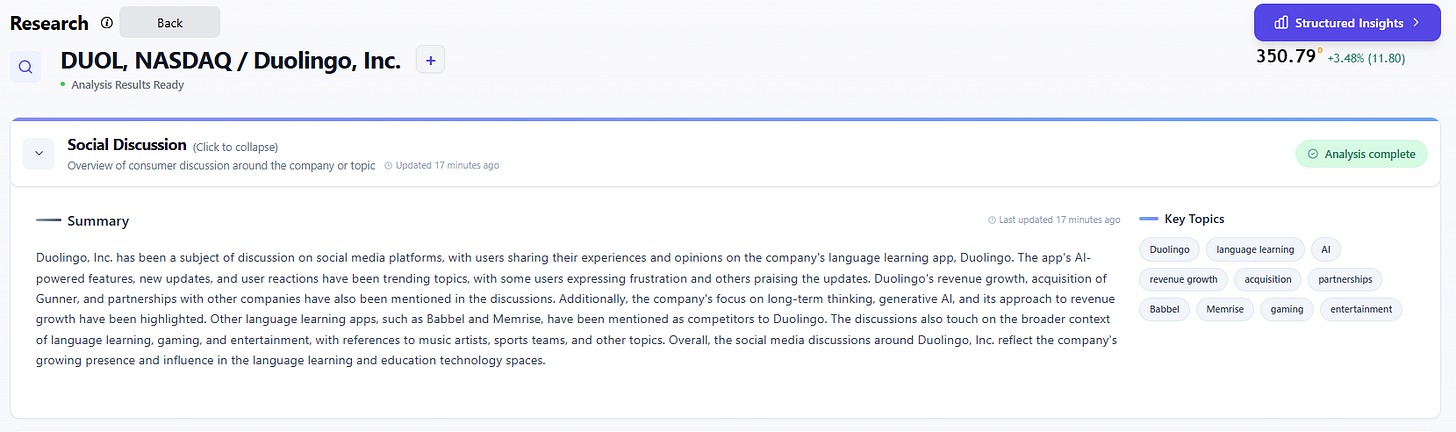 Whether it’s chatter around a new product launch, rising frustration with an app update, or praise for brand partnerships, the tool highlights the narrative forming around that company.