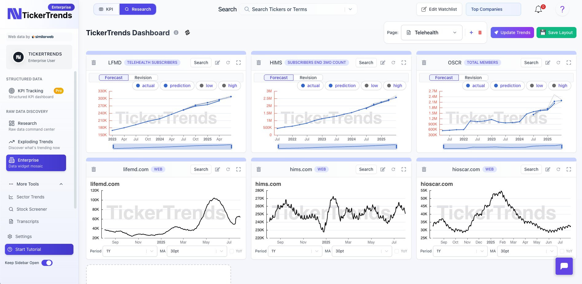 In the Enterprise Mosaic view, you can now customize your dashboard with KPI forecasts and tracker widgets. This is fully customizable to be what the user wants to track from our coverage of multiple 100’s of public tickers.