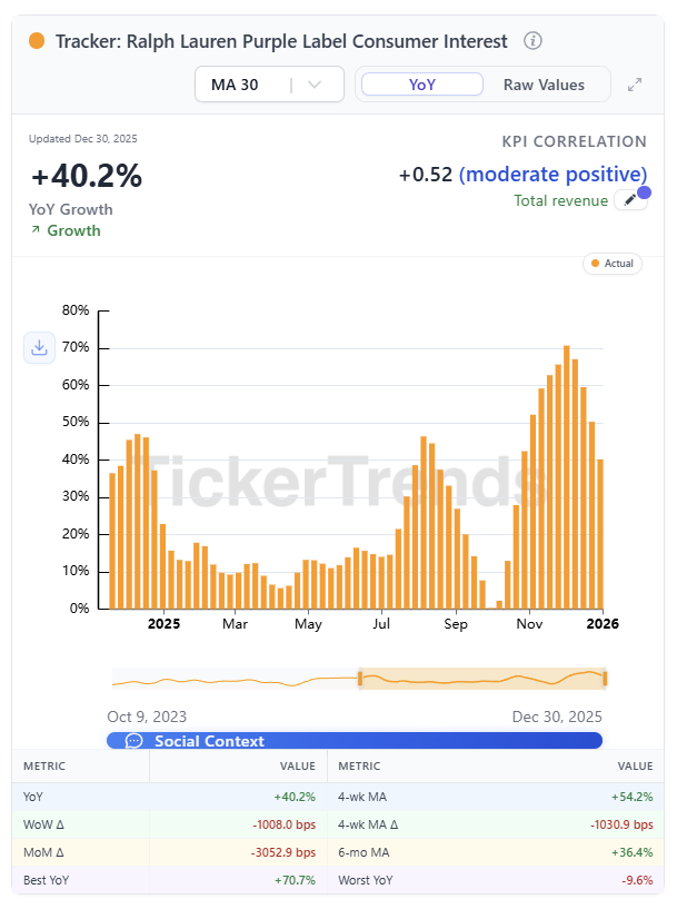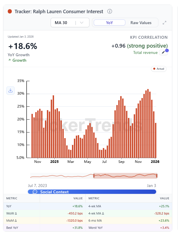 Consumer interest across Ralph Lauren’s core brand continues to look healthy. Our primary consumer interest trackers accelerated meaningfully through much of the quarter, reflecting strong brand engagement and demand momentum. That said, growth rates have pulled back modestly into quarter end from elevated levels earlier in the period. This looks more like normalization from strong comps rather than a sharp deterioration.