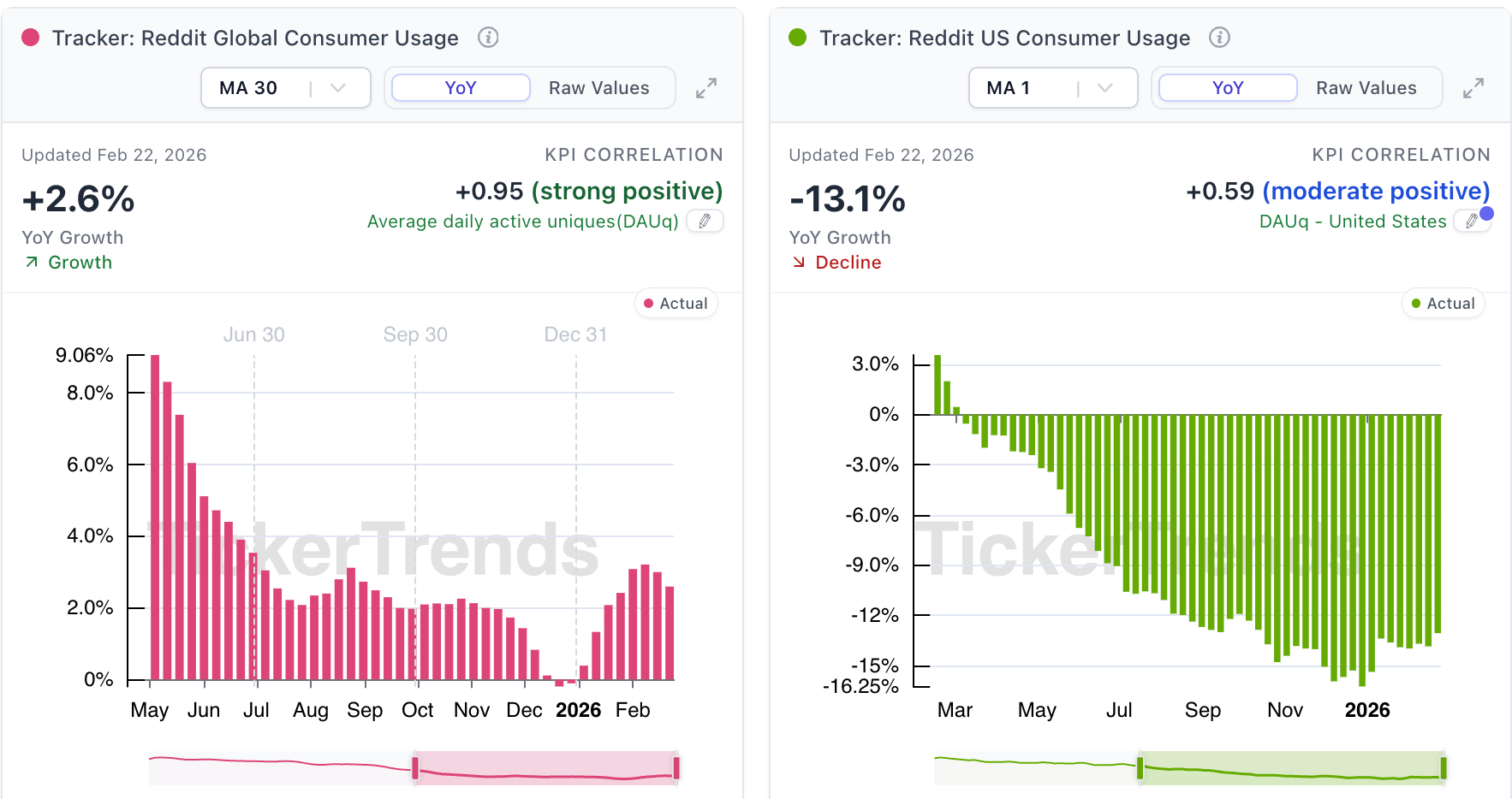 Labeled “good bots” will no longer contribute to human DAU counts, and ongoing aggressive removal of nefarious bots will further clean the user base. While global DAUq grew 19% YoY to 121.4 million in Q4 2025, logged-in DAU growth has been decelerating (particularly in the higher-value U.S. market). Any visible flattening or temporary dip in growth rates from this cleanup could heighten investor scrutiny around user maturation and saturation in key geographies.