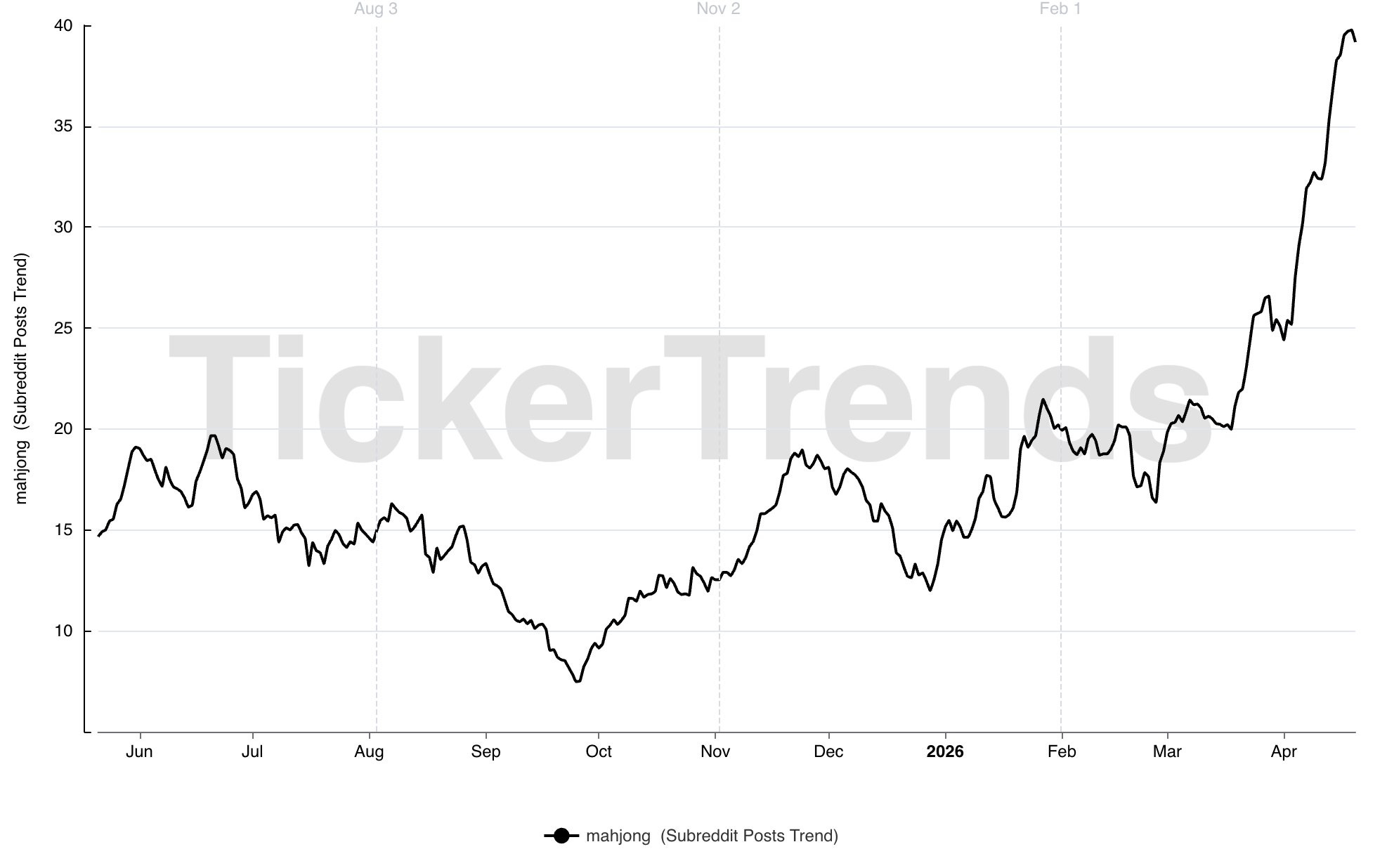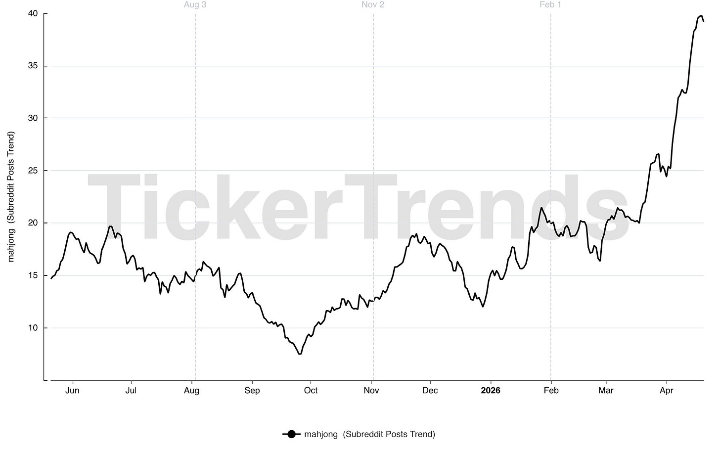 Discussion around Mahjong remained relatively stable for most of the prior year before accelerating sharply to new highs.