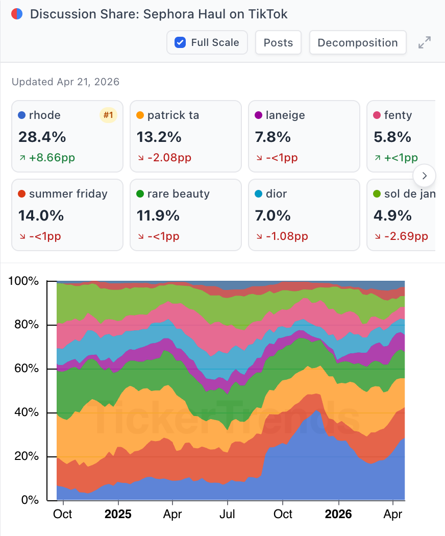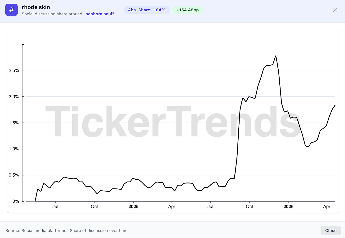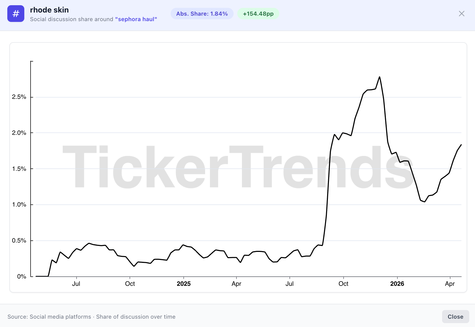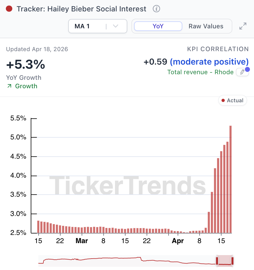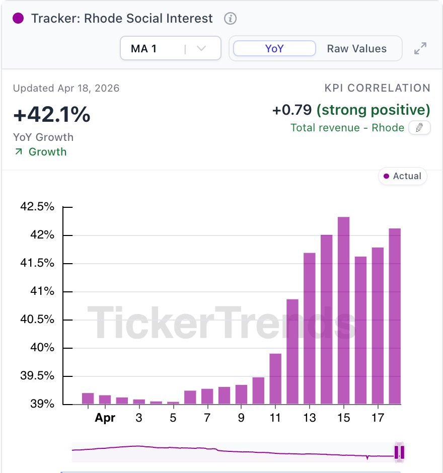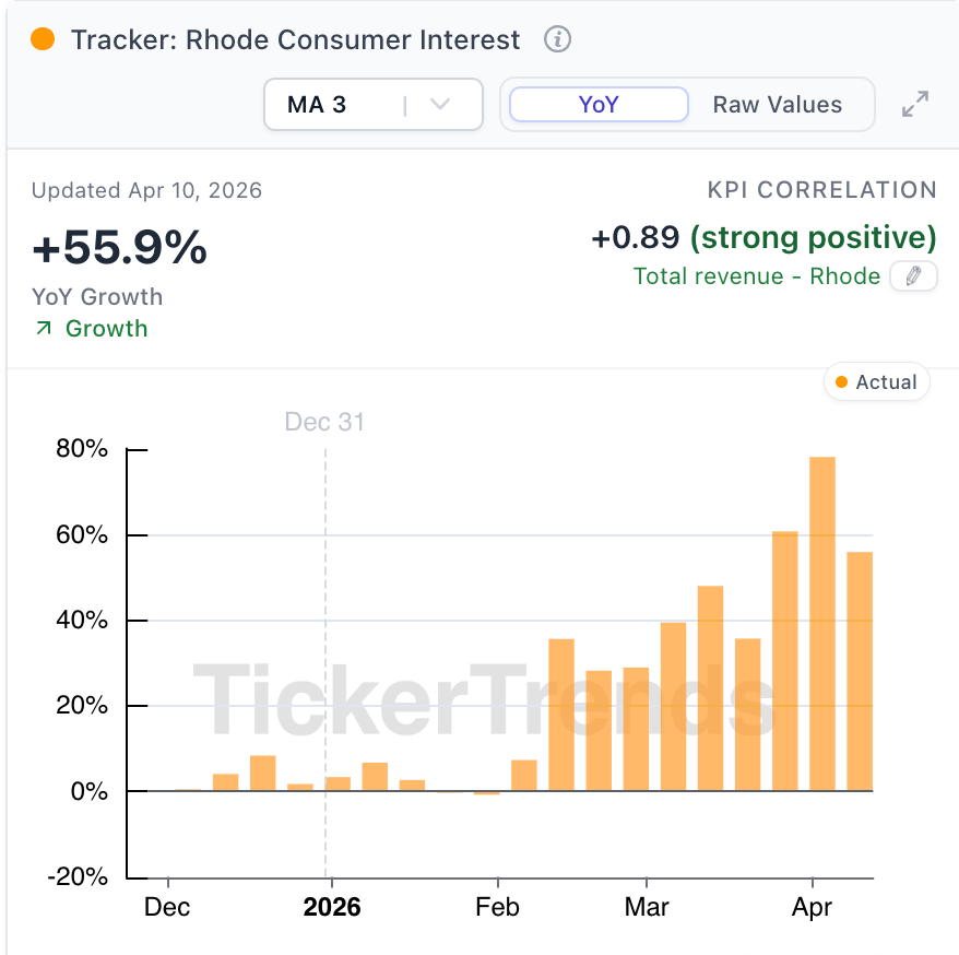 With trackers accelerating to +53.5% YoY, the current trajectory suggests that Rhode is not simply benefiting from a temporary spike, but may be entering a sustained step-change in growth, driven by a culturally embedded catalyst rather than paid acquisition.