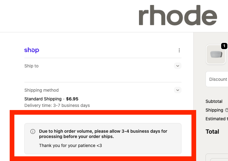The high-order-volume notice currently live on Rhode’s checkout reads: “Due to high order volume, please allow 3–4 business days for processing before your order ships”.