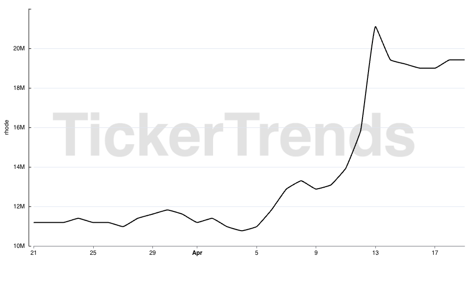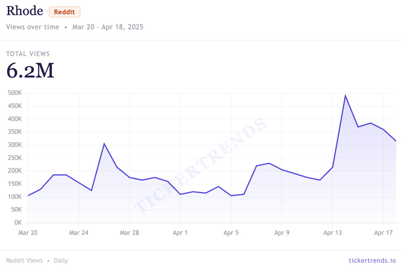 TikTok hashtag views for “rhode” are now sustaining at approximately 20M, up from a pre-Coachella baseline of around 11M, indicating a clear step-change in ongoing engagement.