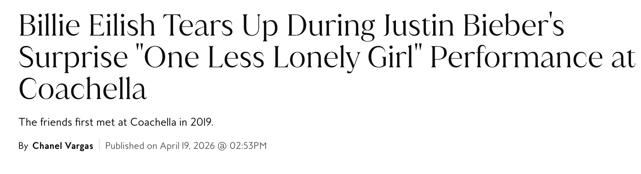 Justin Bieber’s “Daisies” performance reached 11M+ views on YouTube’s official Coachella channel, #1 among all 2026 performances