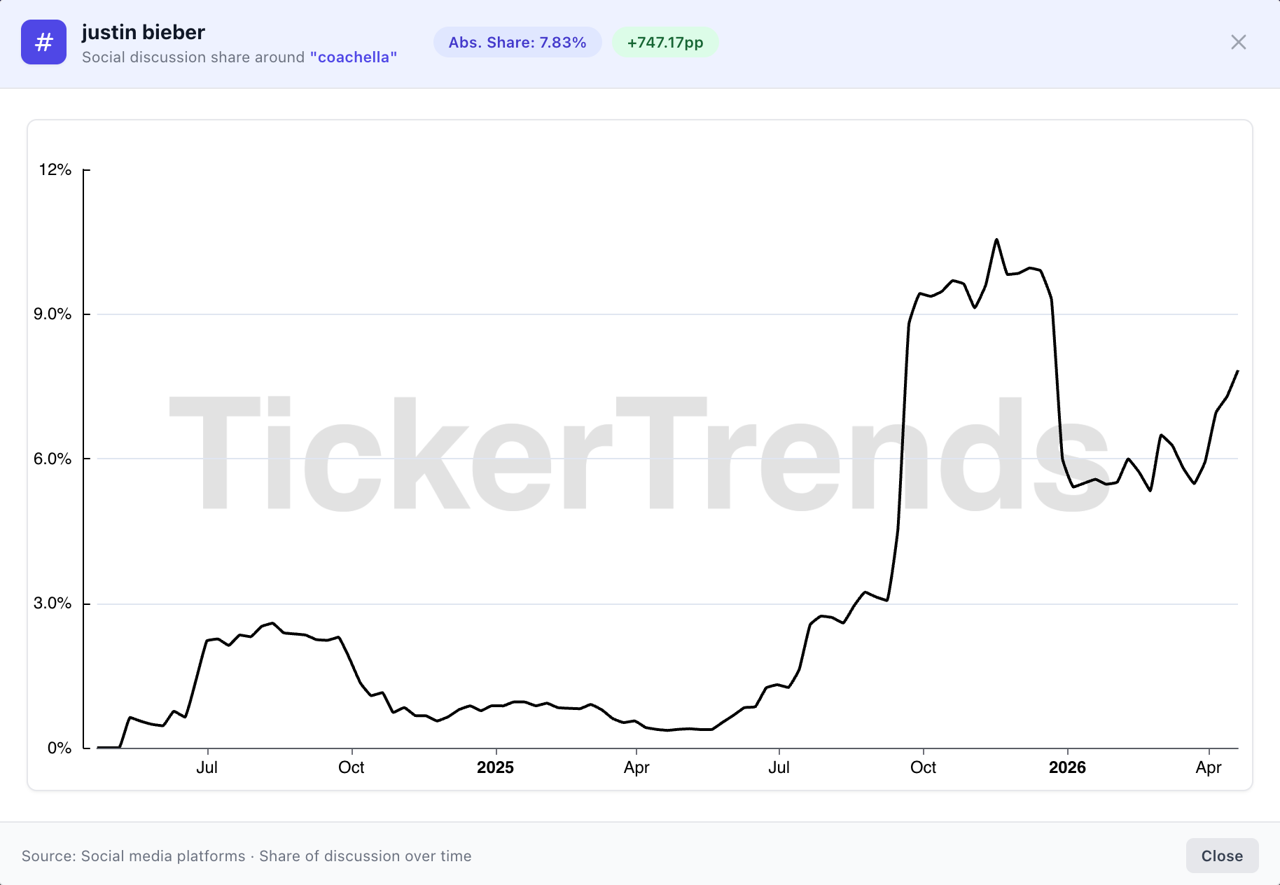 Justin Bieber now ranks number one in social discussion related to Coachella, according to TickerTrends data.