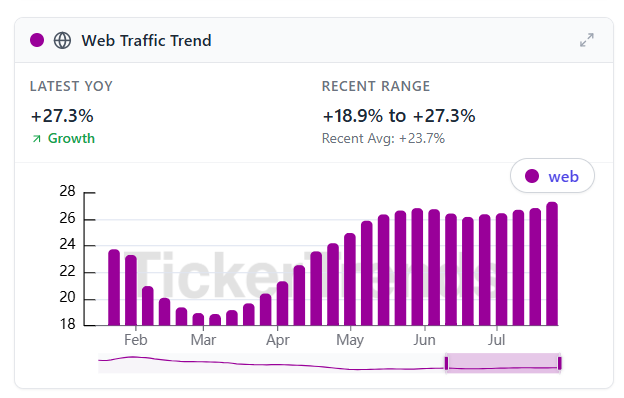 Website traffic remains strong, climbing to +27.3% YoY, with a consistent plateau at elevated levels since late May