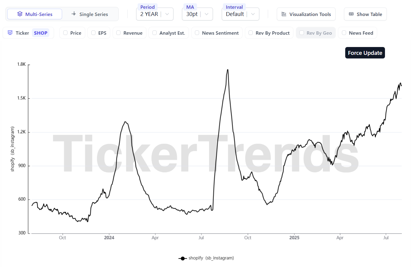 Consumer sentiment and visibility are also trending higher on platforms like Instagram, with the “@shopify” Instagram gaining >1,500 followers/day compared to ~1,000/day before this traction.